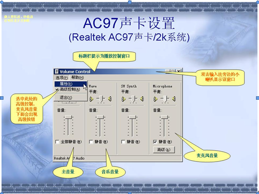 會議室聽到很嘈雜的聲音,同時聽到自己的聲音從遠程傳回來,主要原因:1、遠程用的筆記本自帶的音響和MIC,處理方法:用外接設備,不要用筆記本自帶的音響和MIC;2、外接設備音響和MIC挨的比較近,由于大部分MIC沒有回音抑制功能,音響出來的聲音被MIC重新接收回傳給遠程,遠程就聽到自己的回音,處理方法:用帶回音抑制的MIC設備,如clearone系統產品,其他處理方法:音響和MIC盡量隔遠一些,超過一定距離,MIC接收的聲音會銳減,可以有效避免回音,同時音響聲音不要開太大,以能聽清楚為準;3、聲卡設置問題,雙擊任務右下角的喇叭圖標,彈出聲卡設置窗口,如圖: